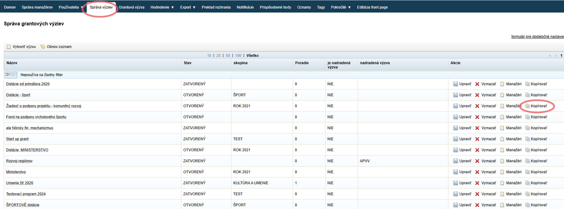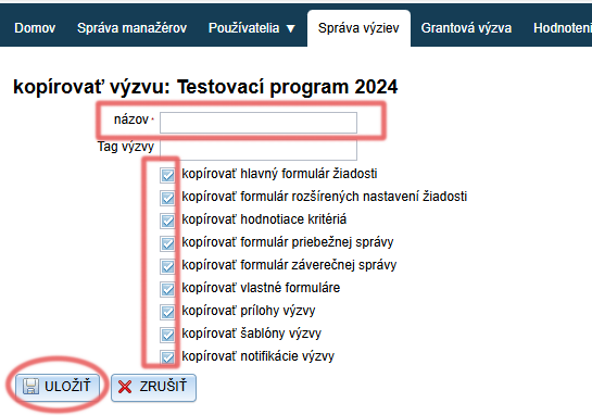 Program (výzvu), ktorú ste už v minulosti vytvorili, môžete tiež skopírovať v záložke „Správa výziev“ (programov).